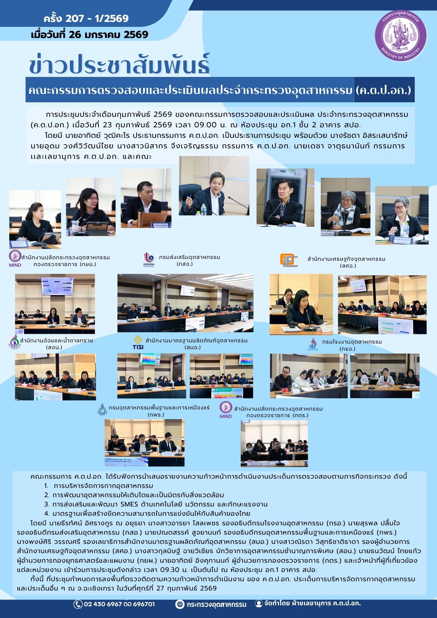 การประชุมประจำเดือนกุมภาพันธ์ 2569 ของคณะกรรมการตรวจสอบและประเมินผล ประจำกระทรวงอุตสาหกรรม (ค.ต.ป.อก.)