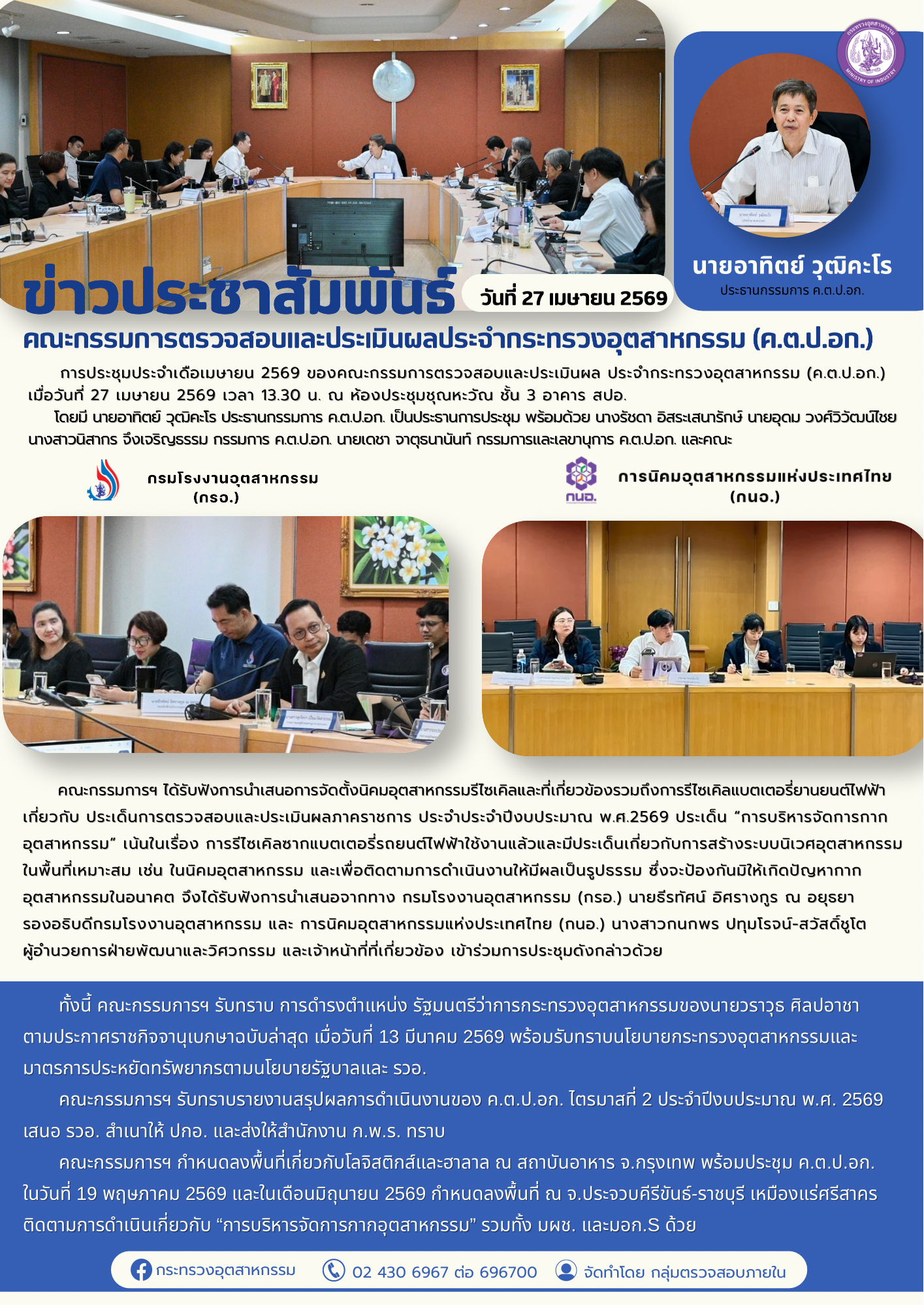 การประชุมประจำเดือเมษายน 2569 ของคณะกรรมการตรวจสอบและประเมินผล ประจำกระทรวงอุตสาหกรรม (ค.ต.ป.อก.) เมื่อวันที่ 27 เมษายน 2569 เวลา 13.30 น. ณ ห้องประชุมชุณหะวัณ ชั้น 3 อาคาร สปอ.